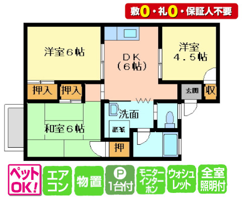 間取り内訳 | 洋室6帖・洋室4.5帖・和室6帖・DK6帖・洗面脱衣所・浴室・トイレ | ||